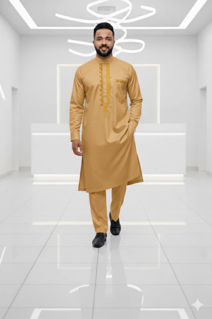 Modern Sophistication: Embroidered Tunic & Trouser SetA contemporary take on traditional wear, this long-sleeved tunic set is designed for the modern man. Featuring a sleek silhouette and refined stitching, it's perfect for both semi-formal events and professional settings.Key FeaturesSleek Tunic Design: Long-sleeved tunic with a stylish Mandarin (stand) collar and side slits for a modern, tailored fit.Refined Embroidery: Subtle yet striking vertical embroidery detail runs along the side of the hidden placket, offering a polished finish.Complete Two-Piece Set: Includes the long-sleeved tunic and matching tailored trousers for a cohesive, ready-to-wear outfit.Premium Solid Colors: Available in versatile, flattering solid tones, including Royal Blue, Rich Brown (or Tan), Classic Beige (or Cream), and Off-White, allowing for easy styling.Occasion: Ideal for work, religious holidays, sophisticated dinners, and formal cultural events.