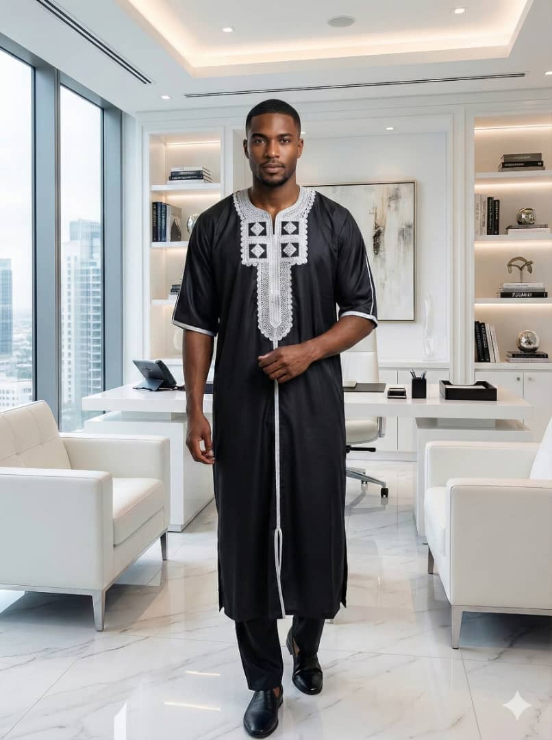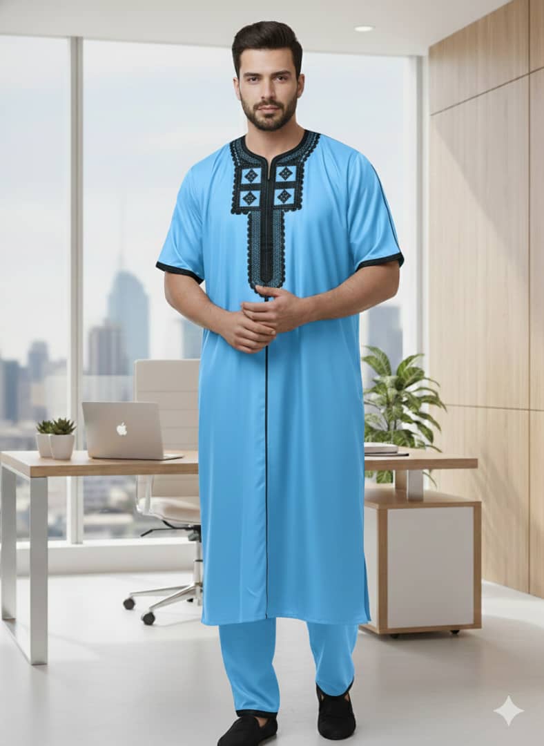 Step into timeless style with our luxurious short-sleeve Kaftan and Trouser set, a perfect blend of tradition and modern sophistication. Inspired by classic Thobe and Caftan designs, this ensemble offers unmatched comfort and elegance for any occasion.Key FeaturesIntricate Neckline Embroidery: Each piece features a bold, contrasting embroidered panel at the chest and collar, lending a high-end, cultural finish.Comfortable Two-Piece Set: Includes a long, loose-fitting tunic/robe with short sleeves and a pair of matching, comfortable trousers for a complete look.Premium Quality Fabric: Made from a lightweight, breathable material that ensures all-day comfort and a graceful drape.Versatile Occasion Wear: Ideal for Eid, Jummah, weddings, traditional ceremonies, parties, or stylish casual wear.Modern Design Details: Features a clean, full-length front-piping (or zipper detail) and side vents on the tunic for ease of movement.Available ColorsEmerald Green with White EmbroideryClassic Black with White Embroiderylack EmbroideryVibrant Sky Blue