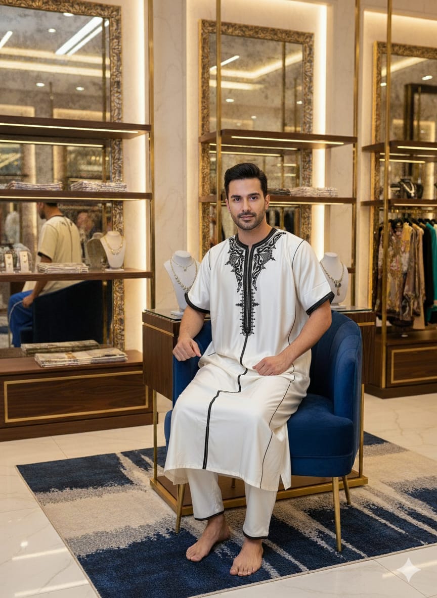 Step into refined comfort with our Luxury Embroidered Gandoura Set, a modern take on classic North African attire. This two-piece ensemble features a beautifully tailored, loose-fitting short-sleeved robe (Gandoura) paired with matching comfortable trousers. Perfect for special occasions, religious gatherings, or upscale casual wear.Key FeaturesPremium Fabric: Crafted from a soft, breathable fabric in a rich cream or off-white hue, ensuring comfort and a graceful drape.Intricate Embroidery: The standout feature is the detailed, handcrafted maroon and black Tlemceni-style embroidery adorning the V-neck and central placket, adding a touch of cultural artistry and sophistication.Versatile Fit: The traditional loose cut provides maximum comfort and ease of movement, while the coordinating trousers complete the contemporary look.Styling: Designed to be worn as a complete set, offering an effortlessly polished appearance.